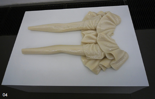 “对称”是人类之于世界的理想认知之一。山本一弥将日常生活中,本身对称的东西选取一点分割,再对称。从而产生类似真实,又非真实的实体。这不是对真实的摹写,而是对想象真实的建构。 “翻版”是这一系列作品的开始,他对于一双鞋子的裁切与重组,产生了一种“似曾相识”的感觉。而这也正是他另一件作品的名字。不仅如此,他还将现实的实在,进行了断然的部分删除,这应该是他有意的取舍。因为,这种取舍使作品摆脱了简单的写实,拥有了在观看过程中不断产生新发现以及想象的快感。而在快感背后,有一股冷冷的进而有些残酷的力量,会在瞬间充满你的视界。展览中的“装饰物”以及“小鹿物语”应是这种感觉的典型作品。初看唯美而平淡,但当你注意到莫名逝去的纤手以及小鹿的头颅,“清酒”的力量已经轰然而至了。